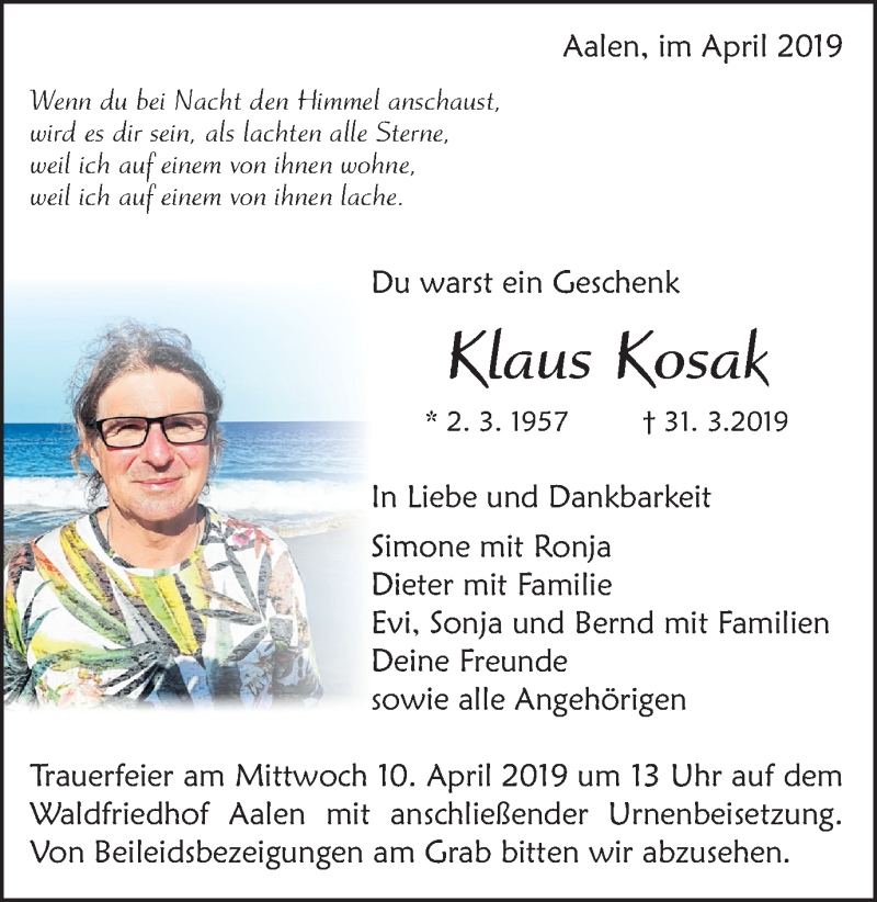 Hier finden Sie alle Traueranzeigen aus der Zeitung, die bisher für Klaus Kosak erschienen sind. Weitere Traueranzeigen, die in der Zeitung erscheinen, werden hier ebenfalls aufgelistet