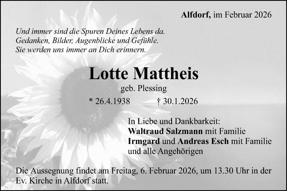 Hier finden Sie alle Traueranzeigen aus der Zeitung, die bisher für Lotte Mattheis erschienen sind. Weitere Traueranzeigen, die in der Zeitung erscheinen, werden hier ebenfalls aufgelistet