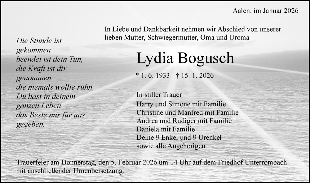 Hier finden Sie alle Traueranzeigen aus der Zeitung, die bisher für Lydia Bogusch erschienen sind. Weitere Traueranzeigen, die in der Zeitung erscheinen, werden hier ebenfalls aufgelistet