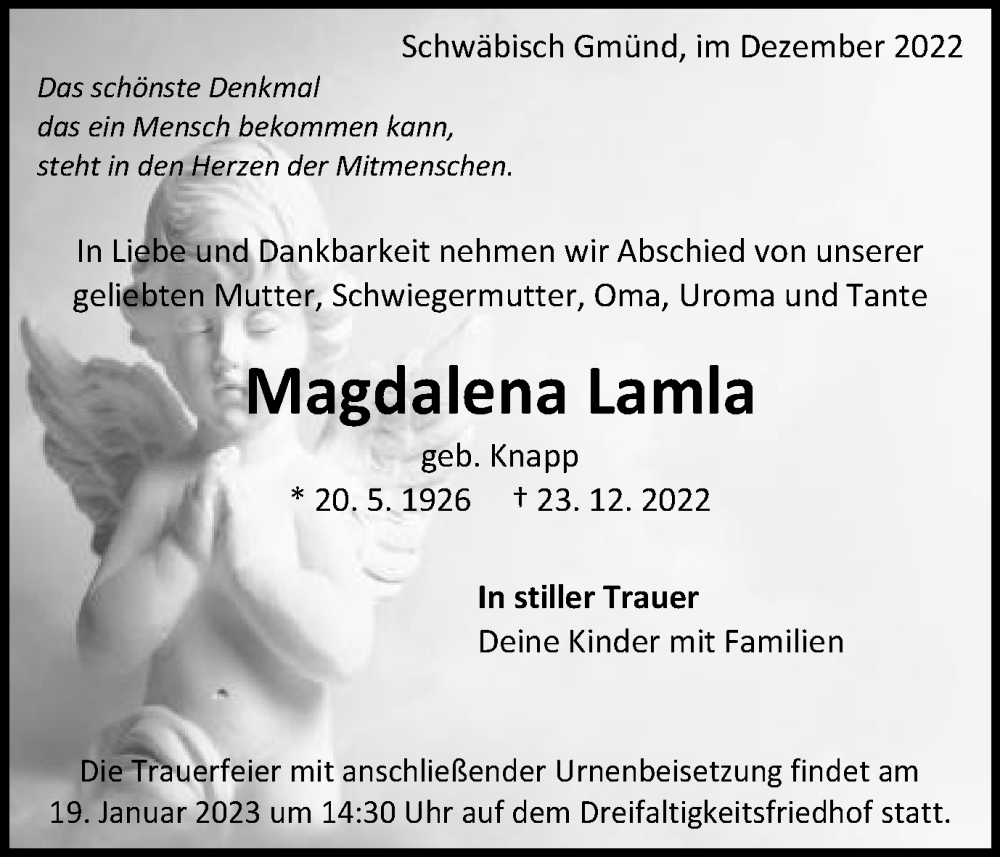 Hier finden Sie alle Traueranzeigen aus der Zeitung, die bisher für Magdalena Lamla erschienen sind. Weitere Traueranzeigen, die in der Zeitung erscheinen, werden hier ebenfalls aufgelistet