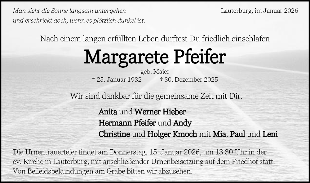 Hier finden Sie alle Traueranzeigen aus der Zeitung, die bisher für Margarete Pfeifer erschienen sind. Weitere Traueranzeigen, die in der Zeitung erscheinen, werden hier ebenfalls aufgelistet