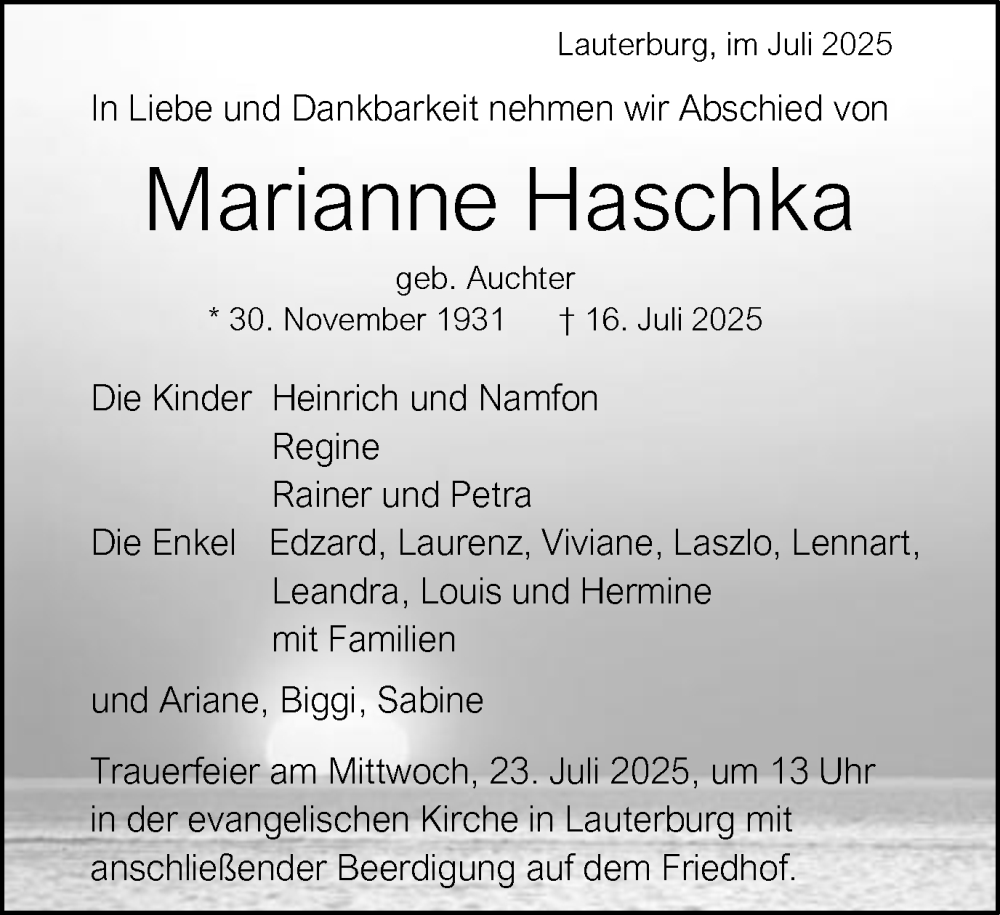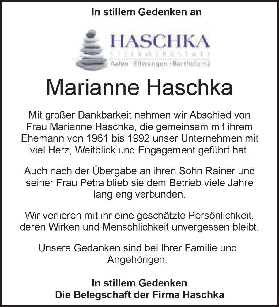 Hier finden Sie alle Traueranzeigen aus der Zeitung, die bisher für Marianne Haschka erschienen sind. Weitere Traueranzeigen, die in der Zeitung erscheinen, werden hier ebenfalls aufgelistet