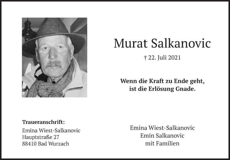 Hier finden Sie alle Traueranzeigen aus der Zeitung, die bisher für Murat Salkanovic erschienen sind. Weitere Traueranzeigen, die in der Zeitung erscheinen, werden hier ebenfalls aufgelistet