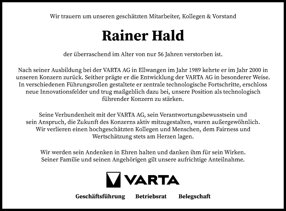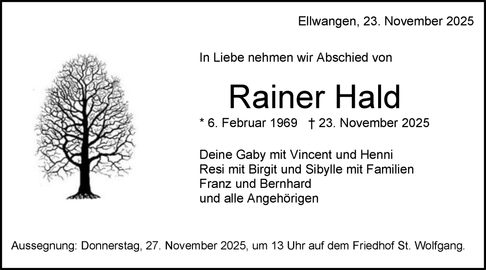 Hier finden Sie alle Traueranzeigen aus der Zeitung, die bisher für Rainer Hald erschienen sind. Weitere Traueranzeigen, die in der Zeitung erscheinen, werden hier ebenfalls aufgelistet
