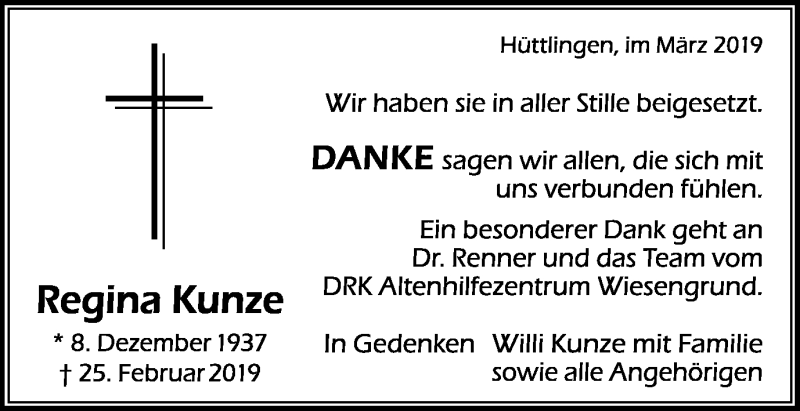 Hier finden Sie alle Traueranzeigen aus der Zeitung, die bisher für Regina Kunze erschienen sind. Weitere Traueranzeigen, die in der Zeitung erscheinen, werden hier ebenfalls aufgelistet