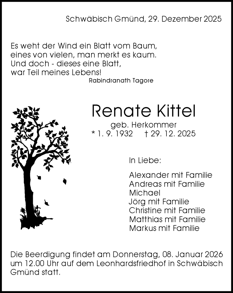 Hier finden Sie alle Traueranzeigen aus der Zeitung, die bisher für Renate Kittel erschienen sind. Weitere Traueranzeigen, die in der Zeitung erscheinen, werden hier ebenfalls aufgelistet