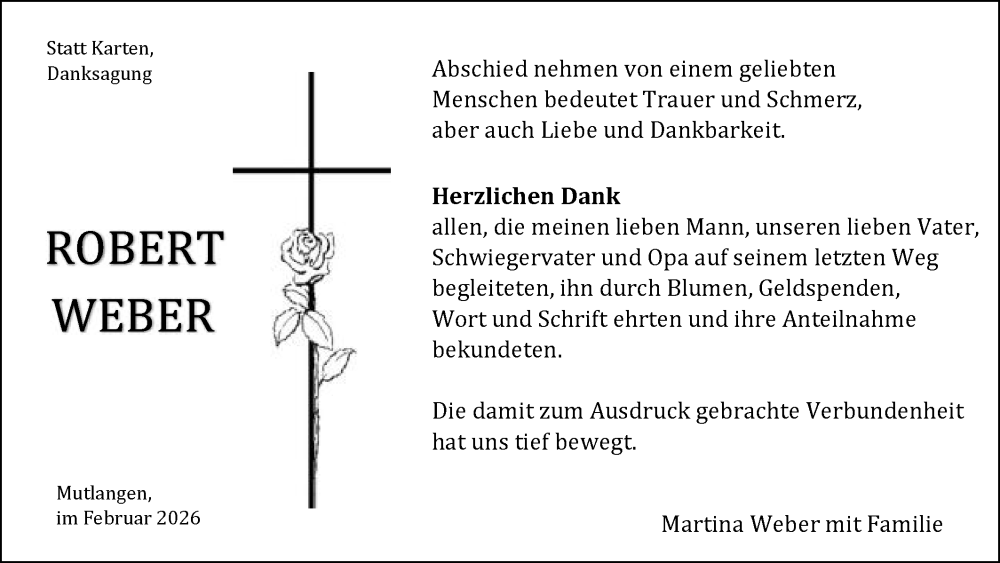 Hier finden Sie alle Traueranzeigen aus der Zeitung, die bisher für Robert Weber erschienen sind. Weitere Traueranzeigen, die in der Zeitung erscheinen, werden hier ebenfalls aufgelistet