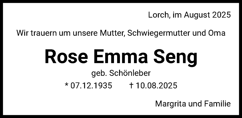 Hier finden Sie alle Traueranzeigen aus der Zeitung, die bisher für Rose Emma Seng erschienen sind. Weitere Traueranzeigen, die in der Zeitung erscheinen, werden hier ebenfalls aufgelistet