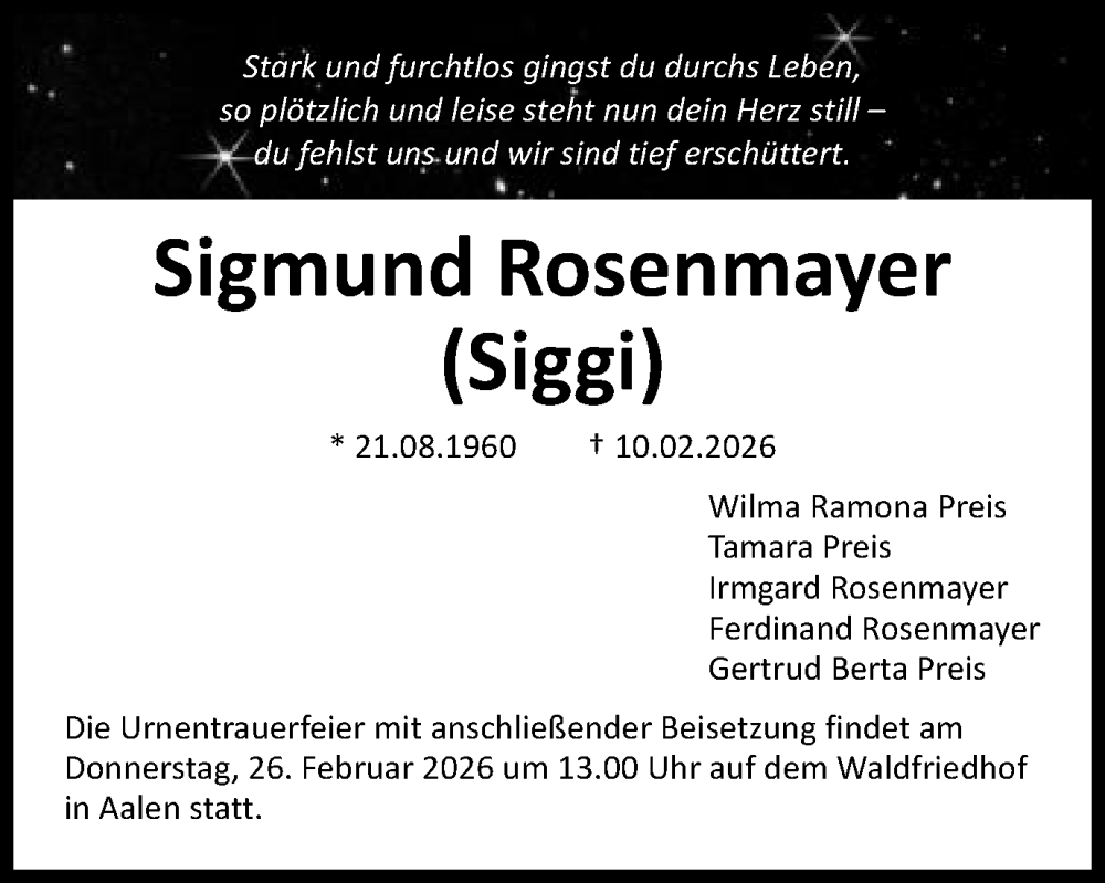 Hier finden Sie alle Traueranzeigen aus der Zeitung, die bisher für Sigmund Rosenmayer erschienen sind. Weitere Traueranzeigen, die in der Zeitung erscheinen, werden hier ebenfalls aufgelistet