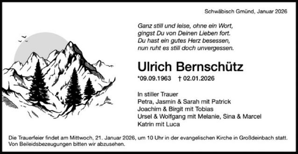 Hier finden Sie alle Traueranzeigen aus der Zeitung, die bisher für Ulrich Bernschütz erschienen sind. Weitere Traueranzeigen, die in der Zeitung erscheinen, werden hier ebenfalls aufgelistet