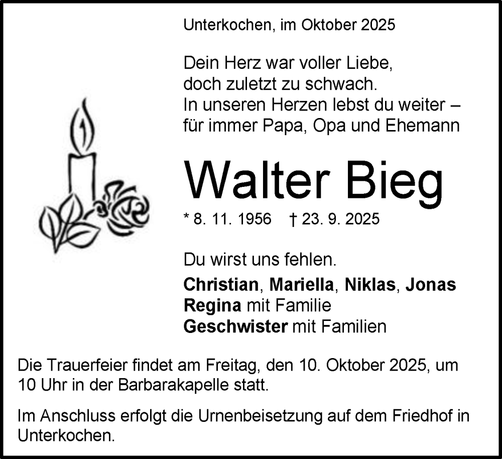 Hier finden Sie alle Traueranzeigen aus der Zeitung, die bisher für Walter Bieg erschienen sind. Weitere Traueranzeigen, die in der Zeitung erscheinen, werden hier ebenfalls aufgelistet