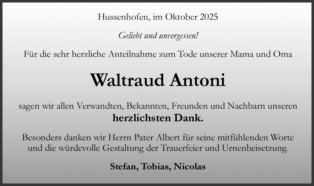 Hier finden Sie alle Traueranzeigen aus der Zeitung, die bisher für Waltraud Antoni erschienen sind. Weitere Traueranzeigen, die in der Zeitung erscheinen, werden hier ebenfalls aufgelistet