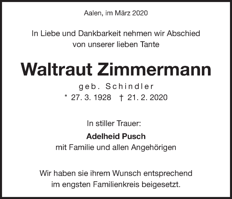 Hier finden Sie alle Traueranzeigen aus der Zeitung, die bisher für Waltraut Zimmermann erschienen sind. Weitere Traueranzeigen, die in der Zeitung erscheinen, werden hier ebenfalls aufgelistet