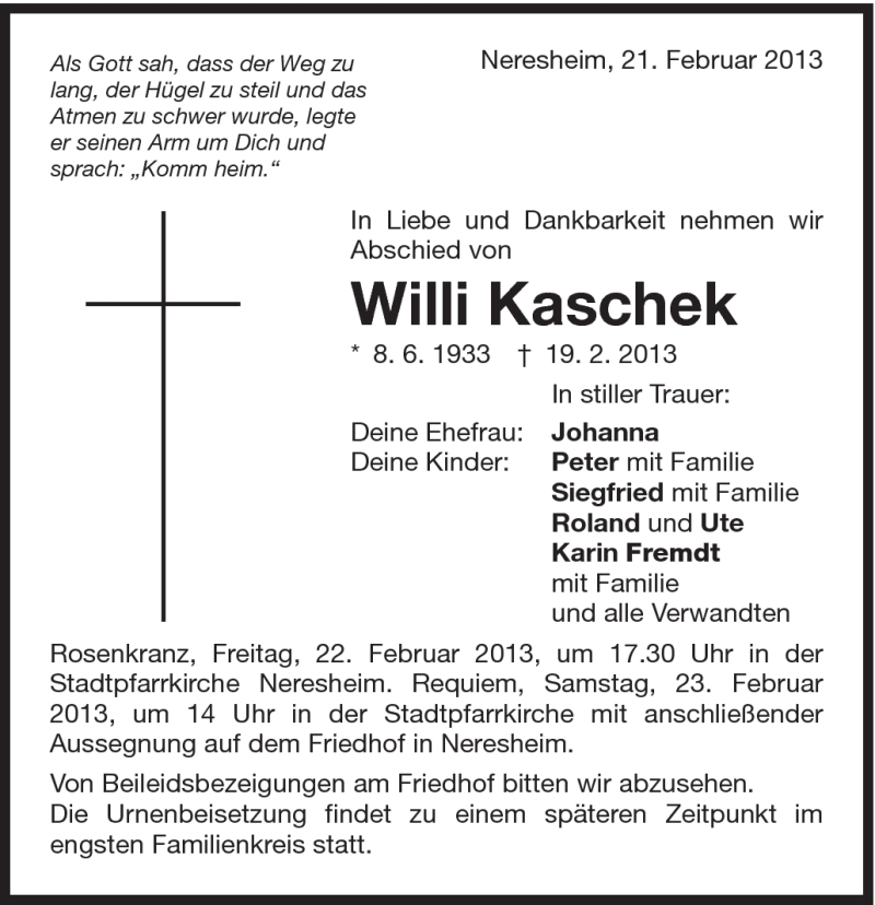 Hier finden Sie alle Traueranzeigen aus der Zeitung, die bisher für Willi Kaschek erschienen sind. Weitere Traueranzeigen, die in der Zeitung erscheinen, werden hier ebenfalls aufgelistet