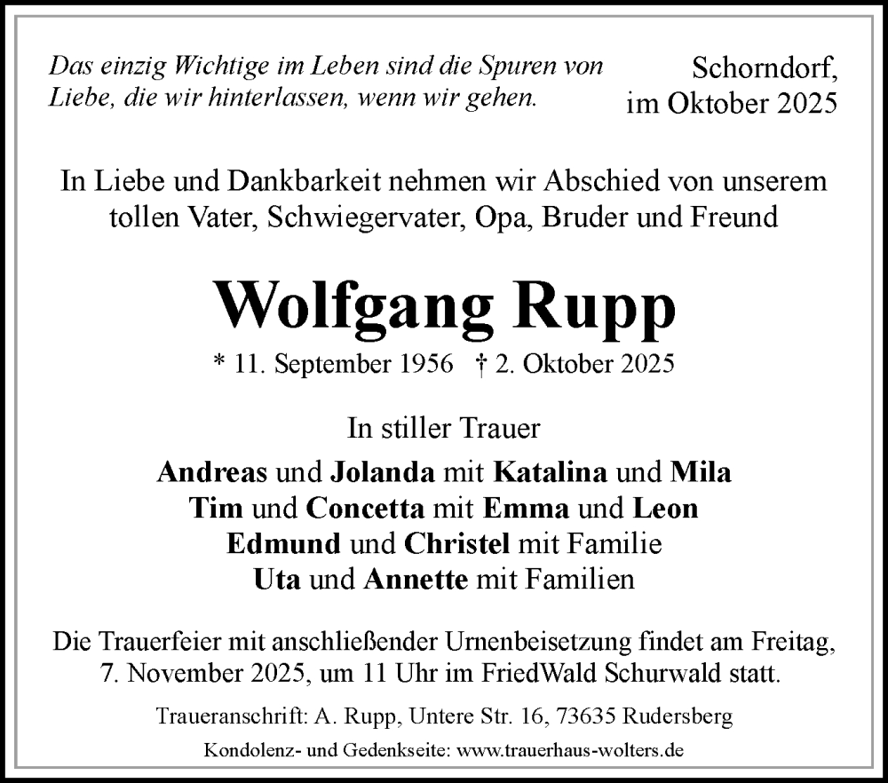 Hier finden Sie alle Traueranzeigen aus der Zeitung, die bisher für Wolfgang Rupp erschienen sind. Weitere Traueranzeigen, die in der Zeitung erscheinen, werden hier ebenfalls aufgelistet
